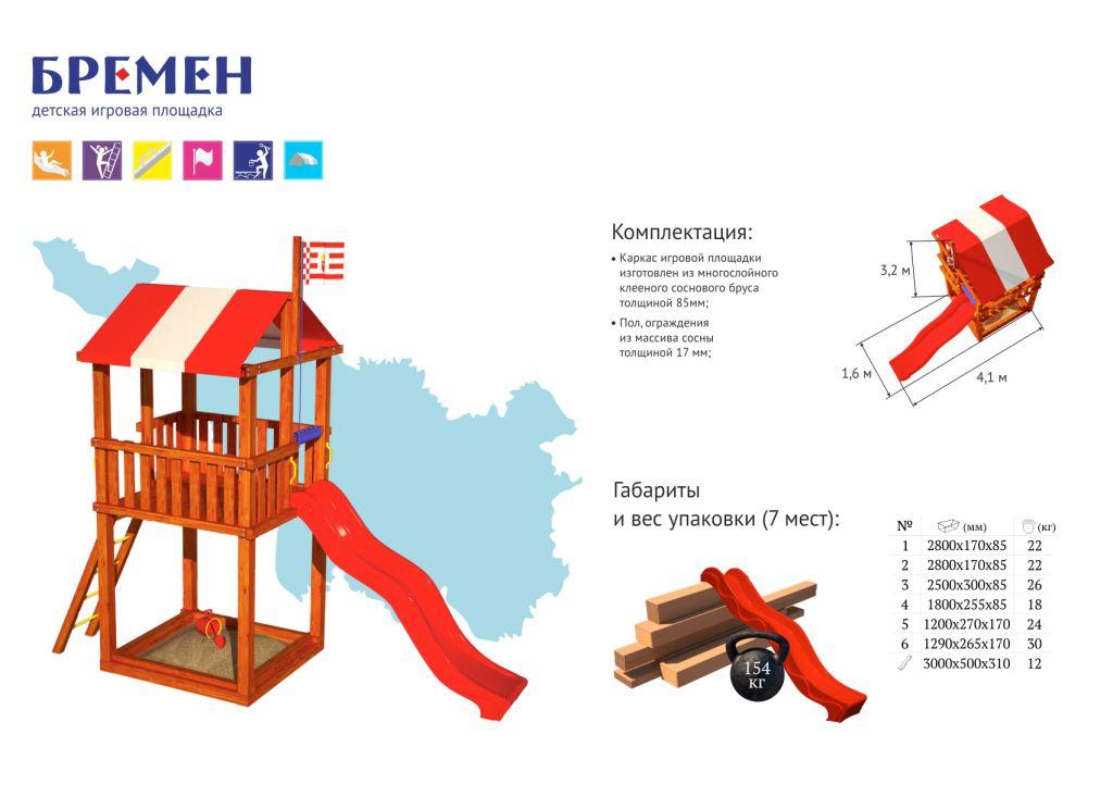 Каркас игровой площадки изготовлен из многослойного клееного соснового бруса толщиной 85мм, пол, ограждения из массива сосны толщиной 17 мм.