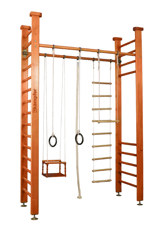 Комплектация: шведская стенка, качели, канат, верёвочная лестница, трапеция, кольца.