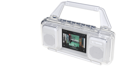 Включенный плеер легко закрепляется внутри футляра, который защищает от пыли, грязи, влажности, пара и брызг воды. Звук от плеера подключается специальным шнуром к мощным стереодинамикам футляра. Ножки придают вашему «телевизору» устойчивое положение, а для переноски есть удобная ручка. Смотрите любимые фильмы и слушайте музыку на даче, в походе, на рыбалке, в сауне, на пляже или в гараже.